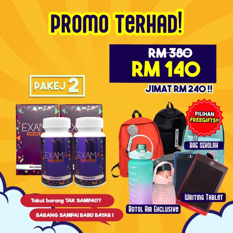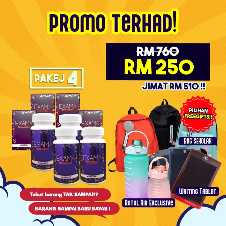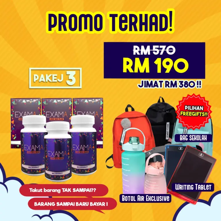 Peluang untuk anda dapatkan EXAMA dengan penjimatan, hadiah dan cabutan bertuah sekarang adalah terhad. Jangan lepaskan peluang. Selepas promosi tamat, tiada lagi hadiah diberikan.